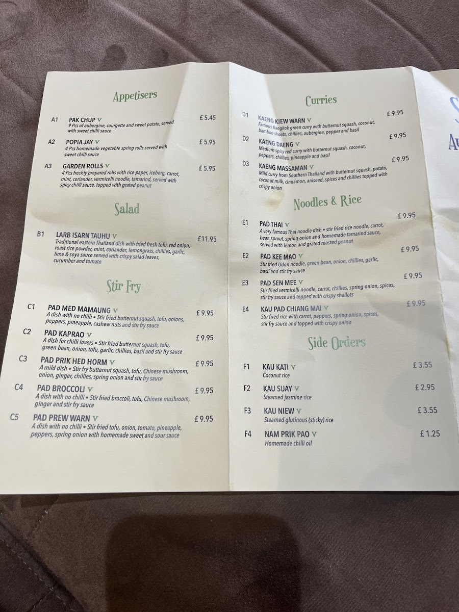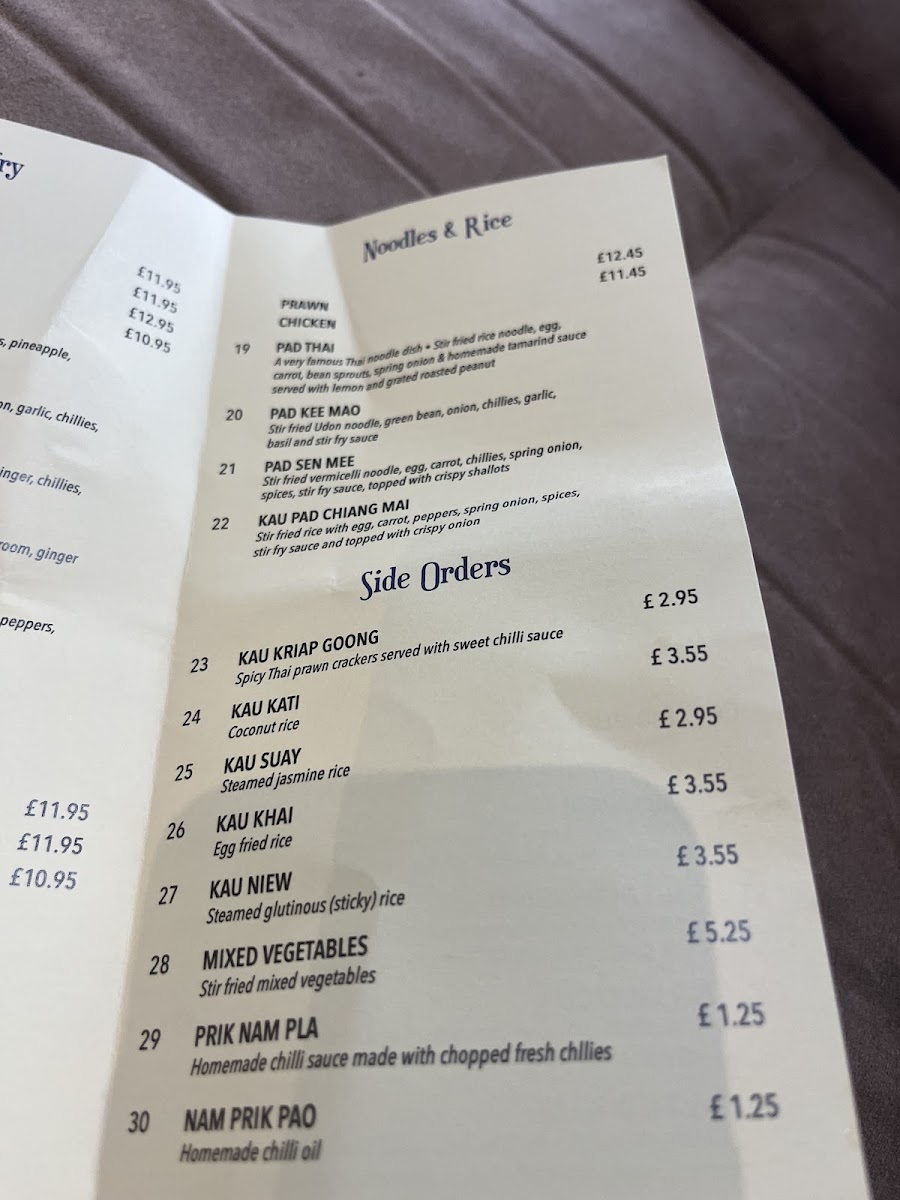 Dining at Songkran Thai Restaurant on The Broadway offers a menu that is both extensive and authentically Thai, catering to a wide range of tastes and spice preferences. The starters, including Chicken Satay, Popia Ped, Muk ChupPak Chup, and Popia Jay, set the tone with vibrant flavors. For salads, the Larb Isarn Zap Zap delivers a refreshing, zesty kick. Meat lovers can indulge in a variety of beef dishes such as Stir Fried Beef, Thai Beef Green Curry, Thai Beef Red Curry, Garlic & Pepper Beef, and Mild Beef Massaman Curry, while chicken options like Thai Chicken Green Curry, Thai Chicken Red Curry, Mild Chicken Massaman Curry, Thai Chicken Panang Curry, and Stir Fried Chicken offer equally satisfying choices. Duck dishes, including Duck Curry and Five Spiced Duck, present richer, more aromatic flavors, whereas seafood enthusiasts will enjoy Thai Prawn Green Curry, Thai Prawn Red Curry, Thai Prawn Panang Curry, Garlic & Pepper Prawns, and Spicy Thai Stir Fried Prawns. Vegetarians are not overlooked, with Vegetable Green Curry and Tofu Green Curry bringing hearty, comforting options. The noodle and rice section is a feast of classics, from Pad Thai and Pad Kee Mao to Pad Sen Mee and Kau Pad Chiang Mai, complemented by side orders like Kau Kriap Goong, Kau Kati, Kau Suay, Kau Khai, and Kau Niew. Finishing the meal, the aromatic Tom Yom provides a perfect balance of sour and spicy notes. Overall, the menu at Songkran Thai Restaurant impresses with its combination of traditional Thai dishes, bold flavors, and diverse choices, ensuring there is something for every palate.